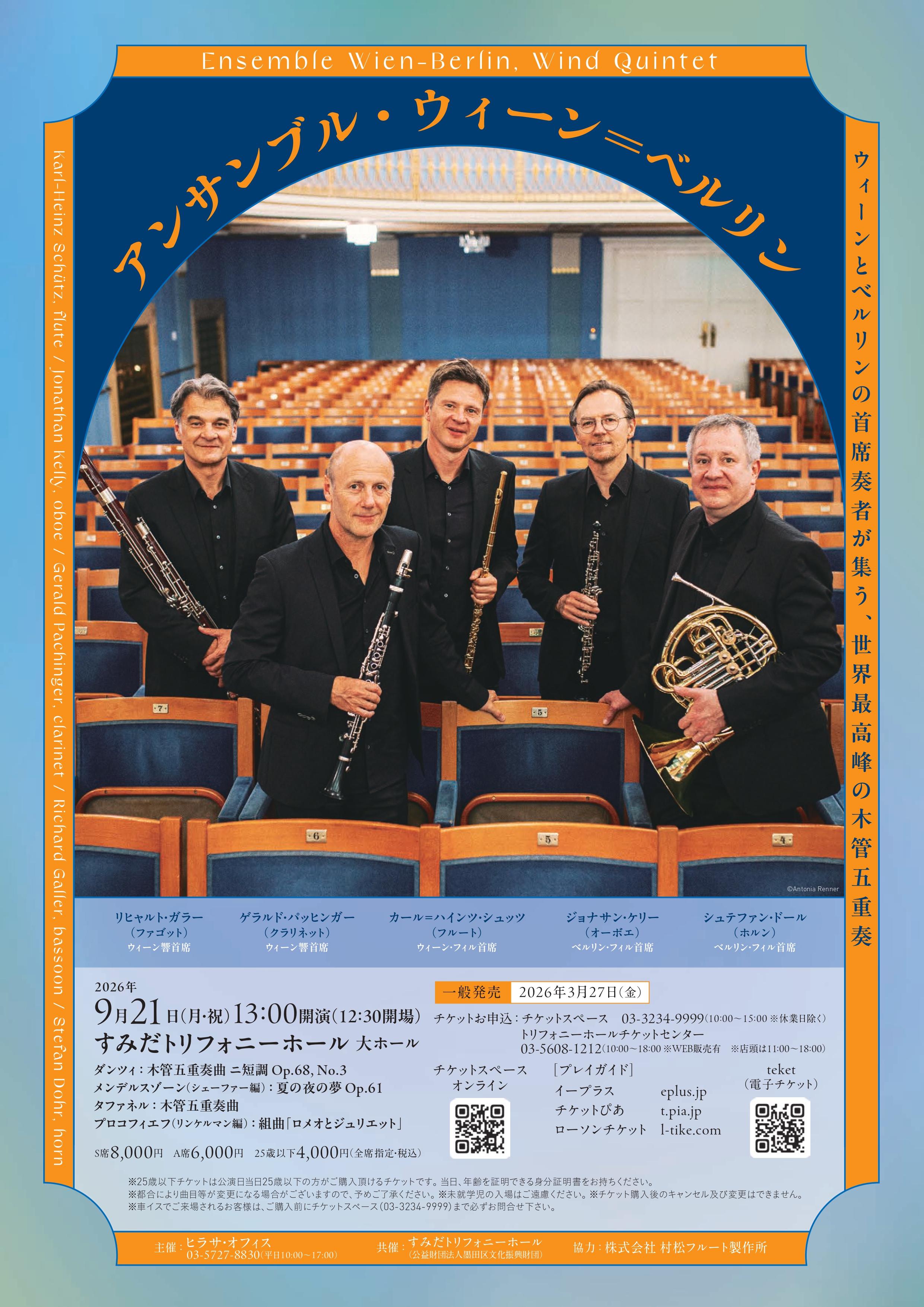 アンサンブル・ウィーン=ベルリン 2026.9.21 すみだトリフォニーホール 大ホール 発売中 | 辻本玲 伊東裕 チェロ・デュオ リサイタル ~響き逢う、2本のチェロ~ 未定 |