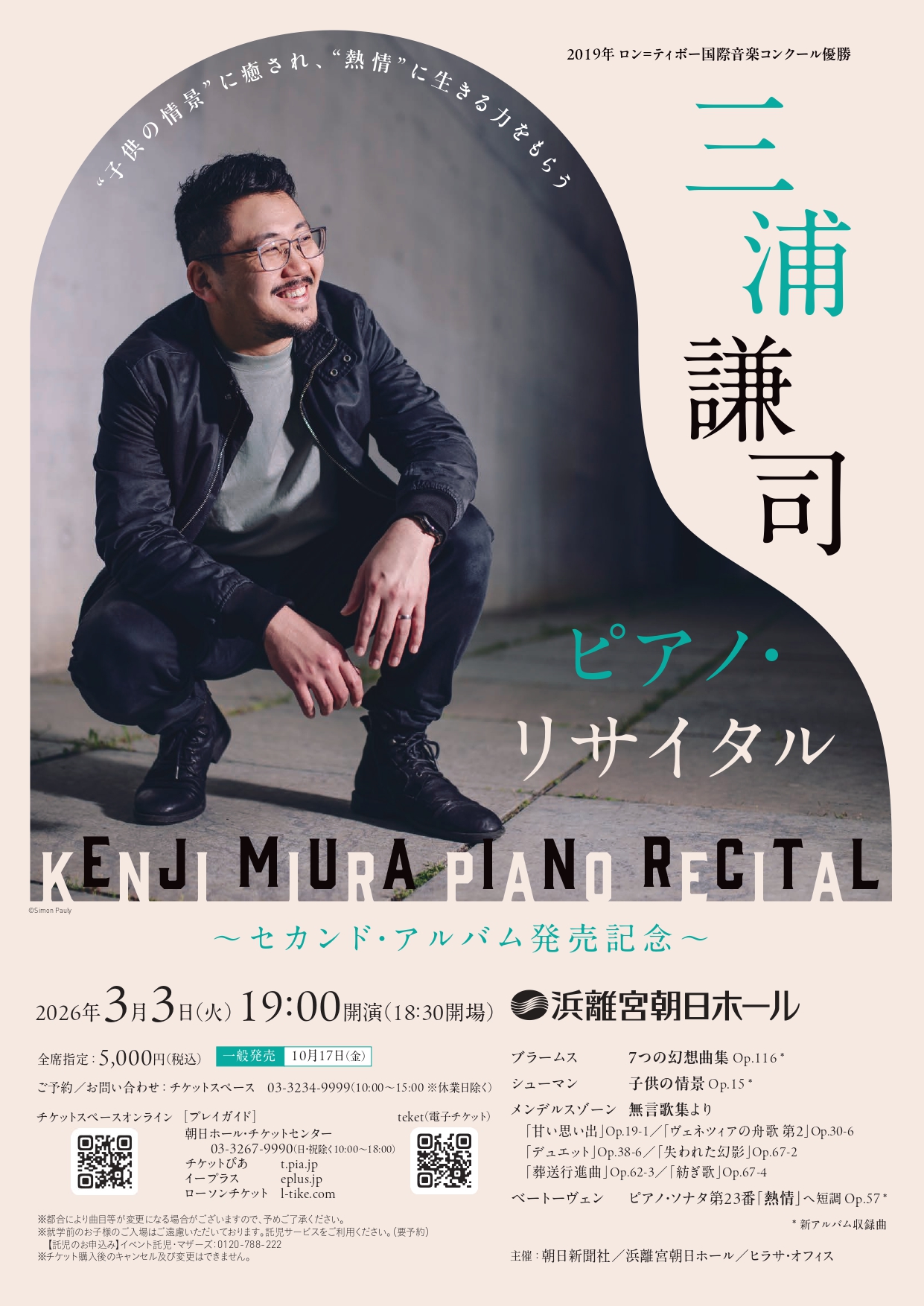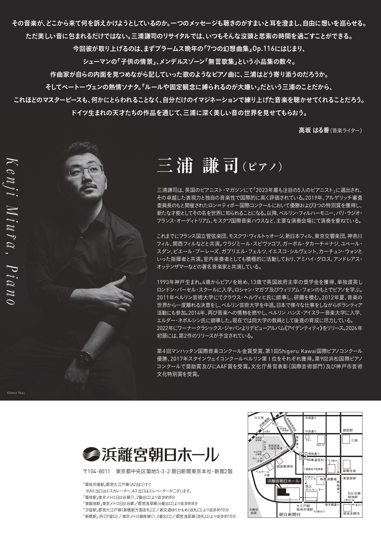 【プログラム】ブラームス:7つの幻想曲集 Op.116 *シューマン:子供の情景 Op.15 * 第1曲 見知らぬ国 Op.15-1 第2曲 不思議なお話 Op.15-2 第3曲 鬼ごっこ Op.15-3 第4曲 おねだり Op.15-4 第5曲 満足 Op.15-5 第6曲 重大な出来事 Op.15-6 第7曲 トロイメライ Op.15-7 第8曲 炉端で Op.15-8 第9曲 木馬の騎士 Op.15-9 第10曲 むきになって Op.15-10 第11曲 こわがらせ Op.15-11 第12曲 眠っている子供 Op.15-12 第13曲 詩人のお話 Op.15-13*****メンデルスゾーン 無言歌集より 第1巻「甘い思い出」Op.19-1 第2巻「ヴェネツィアの舟歌 第2」Op.30-6 第3巻「デュエット」Op.38-6 第6巻「失われた幻影」Op.67-2 第5巻「葬送行進曲」Op.62-3 第6巻「紡ぎ歌」Op.67-4ベートーヴェン:ピアノ・ソナタ第23番「熱情」ヘ短調 Op.57 **新アルバム収録曲=================================================その音楽が、どこから来て何を訴えかけようとしているのか。一つのメッセージも聴きのがすまいと耳を澄まし、自由に想いを巡らせる。ただ美しい音に包まれるだけではない。三浦謙司のリサイタルでは、いつもそんな没頭と思索の時間を過ごすことができる。 今回彼が取り上げるのは、まずブラームス晩年の「7 つの幻想曲集」Op.116にはじまり、シューマンの「子供の情景」、メンデルスゾーン「無言歌集」という小品集の数々。作曲家が自らの内面を見つめながら記していった歌のようなピアノ曲に、三浦はどう寄り添うのだろうか。 そしてベートーヴェンの熱情ソナタ。「ルールや固定観念に縛られるのが大嫌い」だという三浦のことだから、これほどのマスターピースも、何かにとらわれることなく、自分だけのイマジネーションで練り上げた音楽を聴かせてくれることだろう。 ドイツ生まれの天才たちの作品を通じて、三浦に深く美しい音の世界を見せてもらおう。 高坂はる香(音楽ライター)=================================================