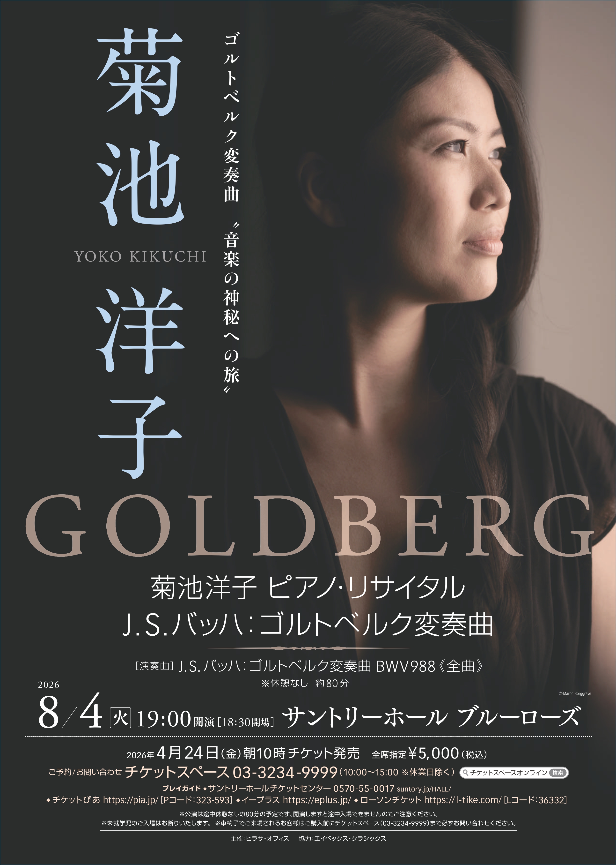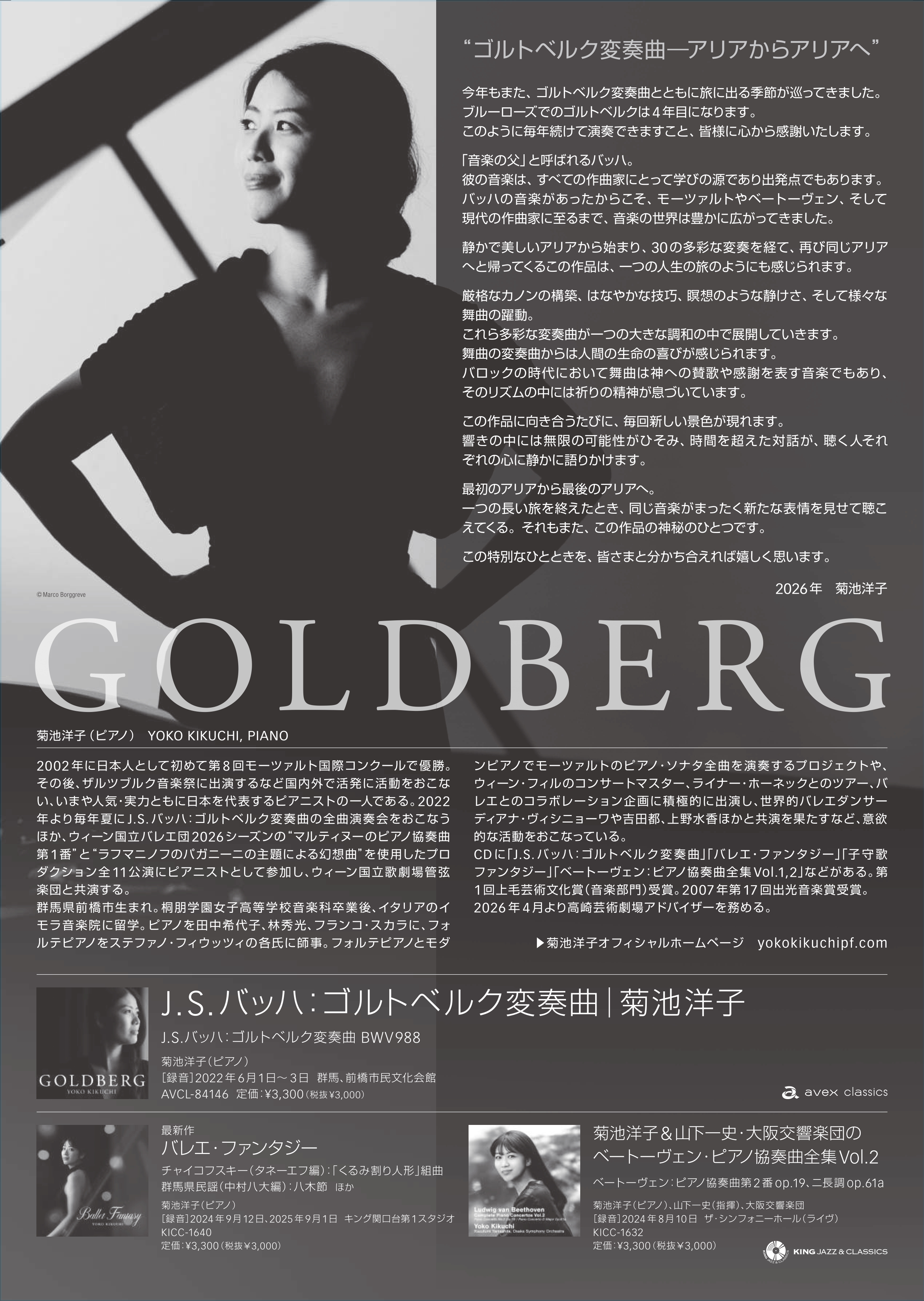 【出演】菊池洋子(ピアノ)【プログラム】J.S.バッハ:ゴルトベルク変奏曲 BWV 988≪全曲≫※休憩なし 約80分■-----------------------------------------------------■《菊池洋子からのコメント》“ゴルトベルク変奏曲ーアリアからアリアへ” 今年もまた、ゴルトベルク変奏曲とともに旅に出る季節が巡ってきました。ブルーローズでのゴルトベルクは4年目になります。このように毎年続けて演奏できますこと、皆様に心から感謝いたします。「音楽の父」と呼ばれるバッハ。彼の音楽は、すべての作曲家にとって学びの源であり出発点でもあります。バッハの音楽があったからこそ、モーツァルトやベートーヴェン、そして現代の作曲家に至るまで、音楽の世界は豊かに広がってきました。静かで美しいアリアから始まり、30の多彩な変奏を経て、再び同じアリアへと帰ってくるこの作品は、一つの人生の旅のようにも感じられます。厳格なカノンの構築、はなやかな技巧、瞑想のような静けさ、そして様々な舞曲の躍動。これら多彩な変奏曲が一つの大きな調和の中で展開していきます。舞曲の変奏曲からは人間の生命の喜びが感じられます。バロックの時代において舞曲は神への賛歌や感謝を表す音楽でもあり、そのリズムの中には祈りの精神が息づいています。この作品に向き合うたびに、毎回新しい景色が現れます。響きの中には無限の可能性がひそみ、時間を超えた対話が、聴く人それぞれの心に静かに語りかけます。最初のアリアから最後のアリアへ。一つの長い旅を終えたとき、同じ音楽がまったく新たな表情を見せて聴こえてくる。それもまた、この作品の神秘のひとつです。この特別なひとときを、皆さまと分かち合えれば嬉しく思います。2026年 菊池洋子■-----------------------------------------------------■============================================================菊池洋子(ピアノ) YOKO KIKUCHI, PIANO2002年に日本人として初めて第8回モーツァルト国際コンクールで優勝。その後、ザルツブルク音楽祭に出演するなど国内外で活発に活動をおこない、いまや人気・実力ともに日本を代表するピアニストの一人である。2022年より毎年夏にJ.S.バッハ:ゴルトベルク変奏曲の全曲演奏会をおこなうほか、ウィーン国立バレエ団2026シーズンの“マルティヌーのピアノ協奏曲第1番”と“ラフマニノフのパガニーニの主題による幻想曲”を使用したプロダクション全11公演にピアニストとして参加し、ウィーン国立歌劇場管弦楽団と共演する。群馬県前橋市生まれ。桐朋学園女子高等学校音楽科卒業後、イタリアのイモラ音楽院に留学。ピアノを田中希代子、林秀光、フランコ・スカラに、フォルテピアノをステファノ・フィウッツィの各氏に師事。フォルテピアノとモダンピアノでモーツァルトのピアノ・ソナタ全曲を演奏するプロジェクトや、ウィーン・フィルのコンサートマスター、ライナー・ホーネックとのツアー、バレエとのコラボレーション企画に積極的に出演し、世界的バレエダンサー ディアナ・ヴィシニョーワや吉田都、上野水香ほかと共演を果たすなど、意欲的な活動をおこなっている。CDに「J.S.バッハ:ゴルトベルク変奏曲」「バレエ・ファンタジー」「子守歌ファンタジー」「ベートーヴェン:ピアノ協奏曲全集Vol.1,2」などがある。第1回上毛芸術文化賞(音楽部門)受賞。2007年第17回出光音楽賞受賞。2026年4月より高崎芸術劇場アドバイザーを務める。▶ 菊池洋子オフィシャルホームページ