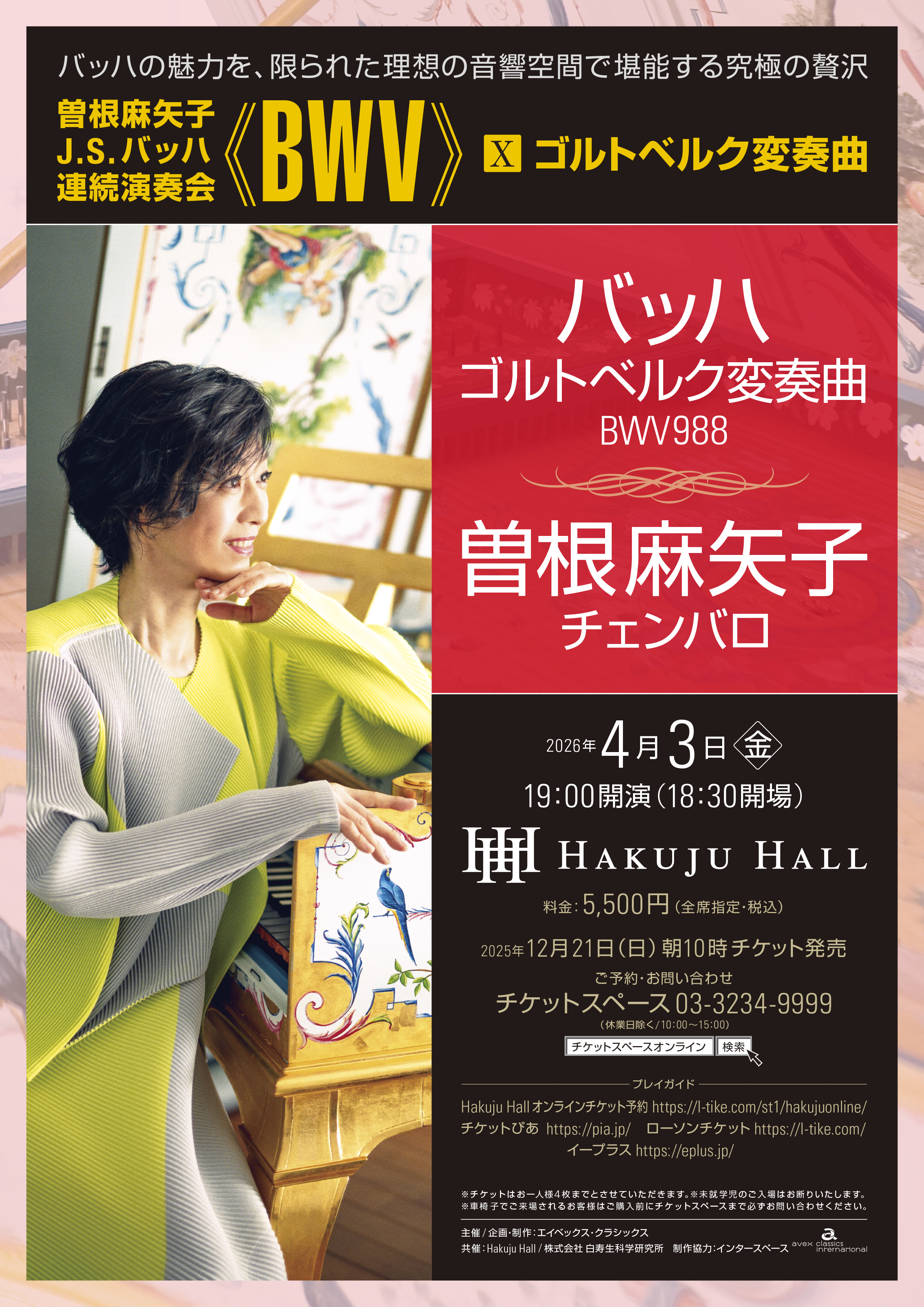 フランスの名門レーベルERATOの名プロデューサー、ミシェル・ガルサンにスコット・ロスの遺志を継ぐ奏者として認められ世界デビューを果たした名アルバム「バッハ:イギリス組曲集」(1991)から約30年。今やチェンバロ奏者の世界的第一人者として活躍を繰り広げている曽根麻矢子が、スイス在住のチェンバロ製作者デヴィッド・レイが彼女のために長い時間をかけて製作した18世紀フレンチモデルの楽器を使用し、バッハのチェンバロ主要作品を演奏する話題のコンサートシリーズ。 ------------------------------------------------------------------------------------------【出演】曽根麻矢子(チェンバロ)【プログラム】J.S.バッハ:ゴルトベルク変奏曲 BWV988(全曲)------------------------------------------------------------------------------------------曽根麻矢子 Mayako Sone桐朋学園大学附属高校ピアノ科卒業。高校在学中にチェンバロと出会い、故鍋島元子に師事。1983年より通奏低音奏者としての活動を開始。1986年ブルージュ国際チェンバロ・コンクールに入賞。その後渡欧を重ね、同コンクールの審査員であった故スコット・ロスに指導を受ける。ロスの夭逝後、彼の衣鉢を継ぐ奏者としてエラート・レーベルのプロデューサーに認められ、1991年に同レーベル初の日本人アーティストとしてCDデビューを果たした。以後イスラエル室内オーケストラのツアーや録音に専属チェンバリストとして参加するほか、フランスおよびイタリア等のフェスティバル参加、現代舞踊家とのコラボレーションなど国際的に活躍。 日本国内でもリサイタル、室内楽と積極的な音楽活動を展開するとともにテレビ、ラジオへの出演、「いきなりパリジェンヌ」(小学館)の刊行など多才ぶりを見せている。録音活動も活発に行い、エイベックス・クラシックスよりCDを多数リリースしている。 また、2003年からの全12回、6年にわたるJ.S.バッハ連続演奏会(浜離宮朝日ホール)に続き、2010年から2014年まで全12回のF.クープランとラモーのチェンバロ作品全曲演奏会(上野学園エオリアンホール)を行い、いずれも好評を博した。1996年「第6回出光音楽賞」をチェンバロ奏者として初めて受賞。1997年飛騨古川音楽大賞奨励賞を受賞。2011年より2018年、「チェンバロ・フェスティバルin東京」では芸術監督をつとめた。2018年、フランスでおこなわれたスカルラッティのソナタ全555曲を演奏するフェスティバル「スカルラッティ555」に出演。その模様はラジオフランスでも放送された。 2019年、フランスのアサス城で開催された『スコット・ロス30周忌リサイタル』に出演。2021年春より、HAKUJU HALLを舞台に、バッハの主要作品を数年間にわたって演奏するコンサートシリーズをスタートさせた。 また、シリーズに合わせた内容で、藤原一弘氏によるバッハオンライン講座をプロデュース2022年新シリーズ『サロンで聴くフランス貴族の音楽』を企画している。曽根麻矢子オフィシャル・ウェブサイト https://mayakosone.com/