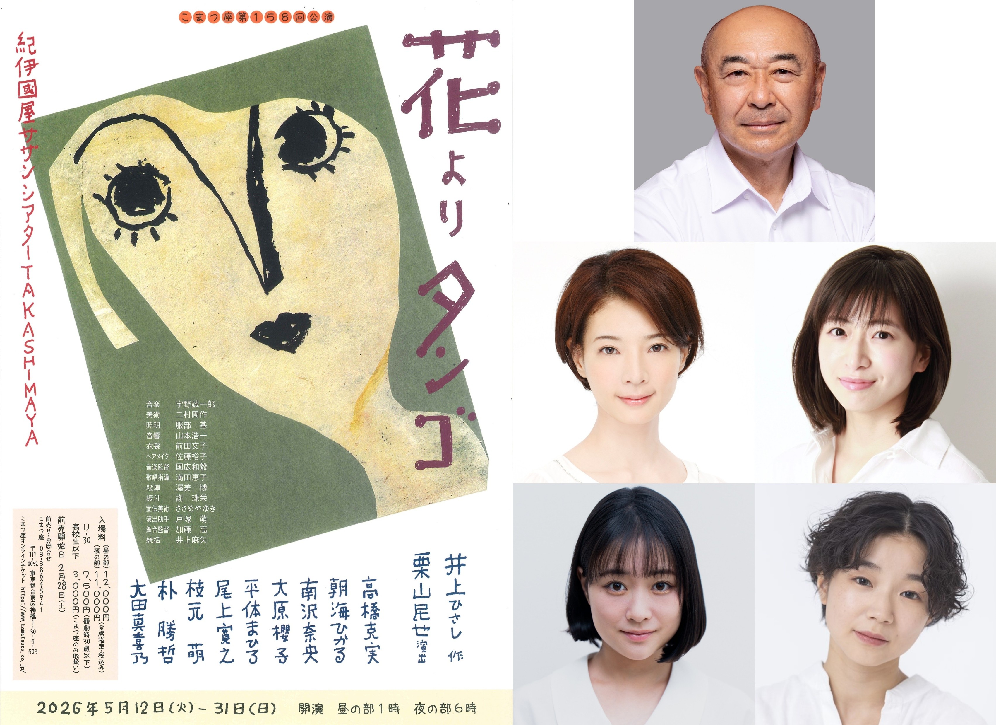 ミュージカル 『レッドブック~私は私を語るひと~』 2026.5.16~31 東京建物 Brillia HALL (豊島区⽴芸術⽂化劇場) ==================== 先行受付を希望のお客様は、 上記チケットスペースオンラインから 会員登録(無料)をお願いします。 【関心のあるジャンル】 メール配信希望欄の「希望する」に☑、 ミュージカルに☑チェックを入れてください。 ◆登録締切:2月18日(水)正午◆ 発売:03月01日(日) | こまつ座第158回公演 「花よりタンゴ」 作:井上ひさし 演出:栗山民也 出演: 高橋克実 朝海ひかる 南沢奈央 大原櫻子 平体まひろ ほか 2026.5.12-31 紀伊國屋サザンシアターTAKASHIMAYA 発売:02月28日(土) |