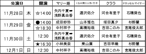 料金:S¥13,000 A¥10,000 B¥8,000 C¥6,000 ☆平日公演のみD¥4,000あり ★11/30(土)16:30公演のみS子ども席(4歳~小学生対象)¥10,000あり(チケットスペースのみ扱い) ●11/29(金)14:00の回は、学生団体鑑賞が入るためS席のみの販売となります