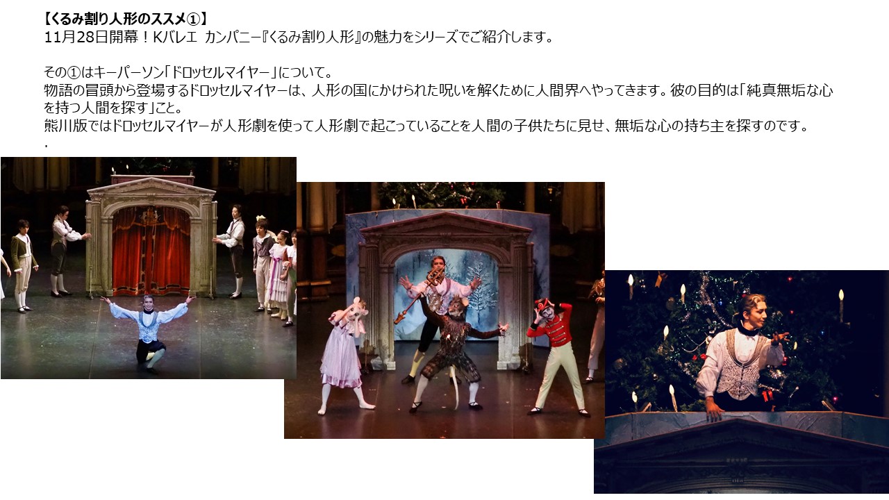 芸術監督:熊川哲也 演出・振付:熊川哲也 原振付:レフ・イワーノフ オリジナル台本:マリウス・プティパ 音楽:ピョートル・イリイチ・チャイコフスキー舞台美術・衣裳デザイン:ヨランダ・ソナベンド/レズリー・トラヴァース照明デザイン:足立 恒指揮:井田勝大管弦楽:シアター オーケストラ トーキョー時は19世紀初め。人形の国では以前よりねずみたちとの領地争いが起こっている。ある日、ねずみの王様は人形王国に魔法をかけ、マリー姫をねずみに、婚約者の近衛兵隊長をくるみ割り人形に変えてしまう。魔法を解く方法はただ一つ、世界一硬いクラカトゥクくるみを割るしかない。だがそのためには純粋無垢な心を持つ人間の力が必要だ。人形の国の王様から命を受けたドロッセルマイヤーはこの人物を探すため、人間界へと旅に出る。そこで出会った少女クララに待ち受けるものは……。