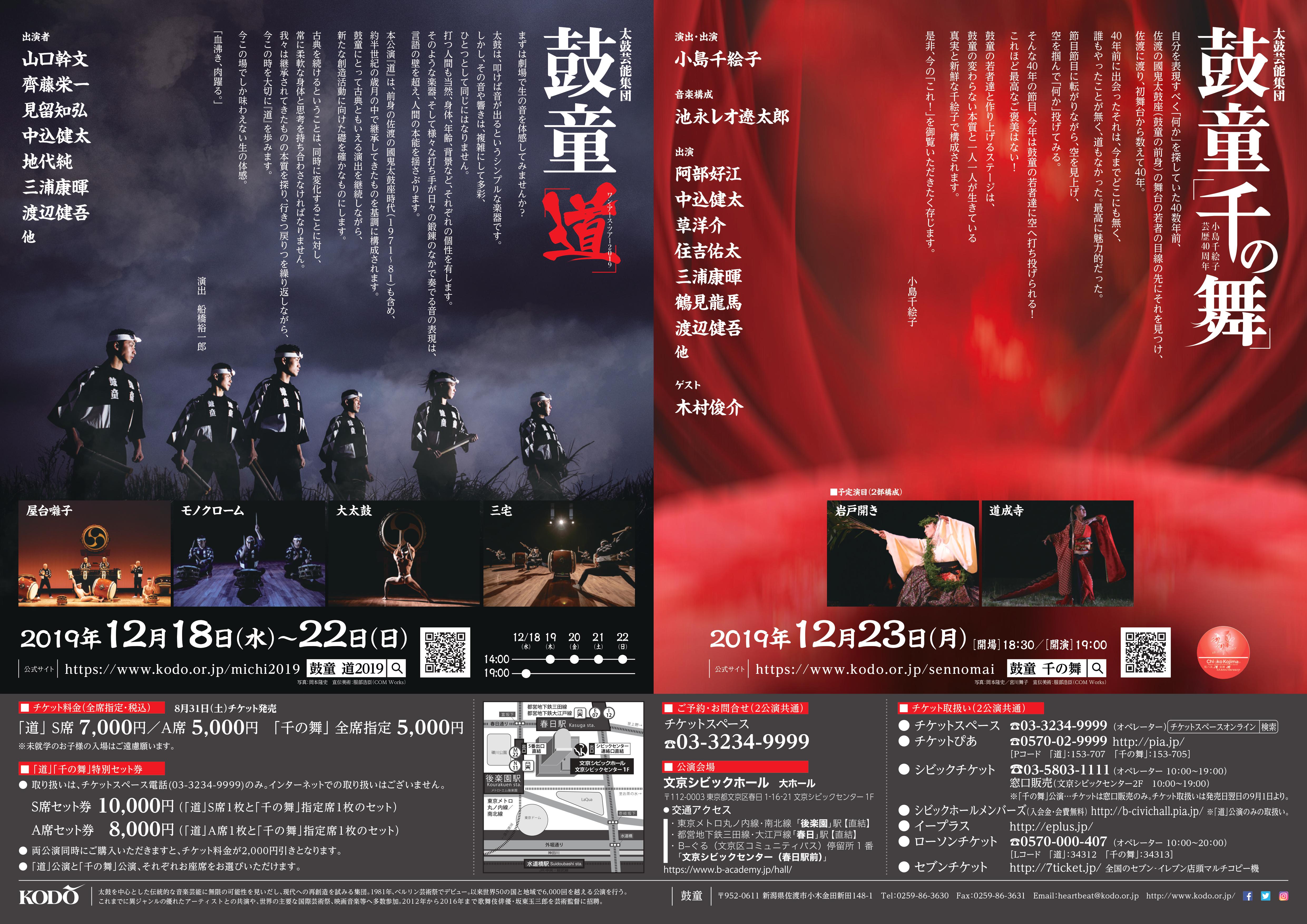 12/23(月)「千の舞」公演との特別セット券も発売! チケットスペース電話[03-3234-9999]のみ取扱い。インターネットでの取り扱いなし。 「道」文京公演・「千の舞」特別セット券 S席セット券 10,000円(「道」S席1枚と「千の舞」指定席1枚のセット)A席セット券 8,000円(「道」A席1枚と「千の舞」指定席1枚のセット)両公演同時にご購入いただきますと、チケット料金が2,000円引きとなります。「道」公演と「千の舞」公演、それぞれお座席お選びいただけます。※開場は開演の30分前※未就学児入場不可※車椅子でご来場されるお客様はご購入前にチケットスペースまで必ずお問い合わせください。