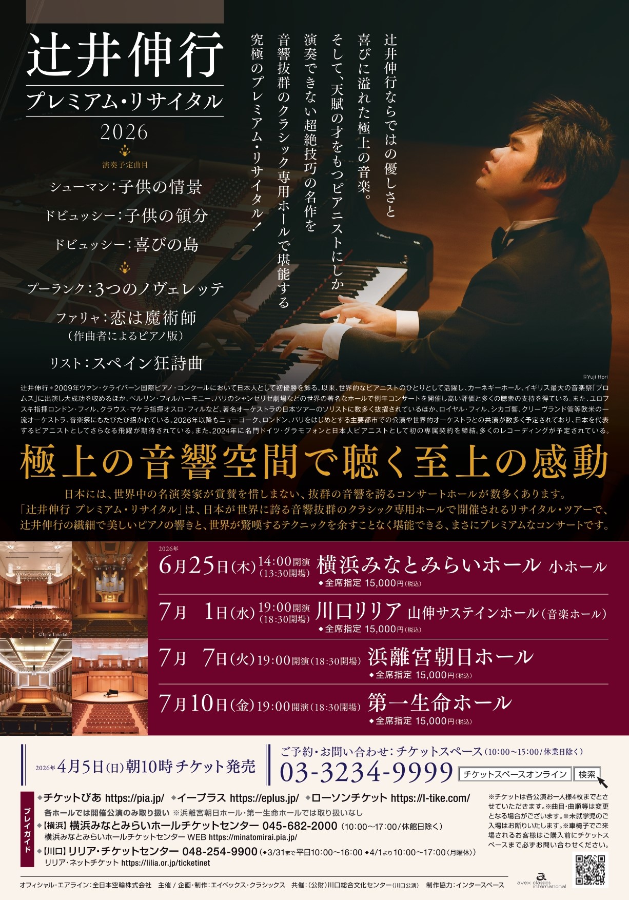 辻井伸行ならではの優しさと喜びに溢れた極上の音楽。そして、天賦の才をもつピアニストにしか演奏できない超絶技巧の名作を音響抜群のクラシック専用ホールで堪能する究極のプレミアム・リサイタル!